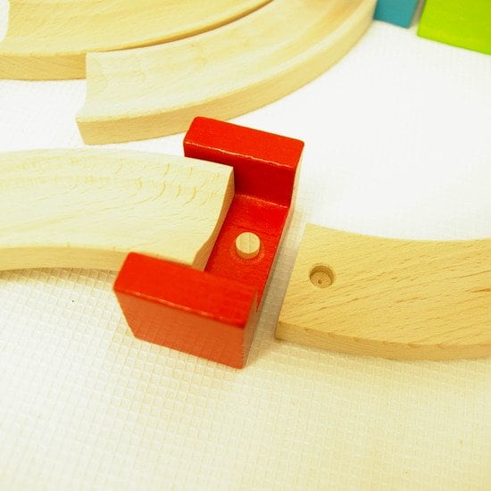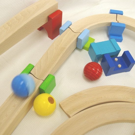 ジョイント積み木でコースが固定でき崩れにくいです。またビー玉よりもかなり大きな木製の玉で握りやすく、また安心して「玉落とし」を楽しむことができます。積み木遊びの基本、積み上げる、並べるなどが楽しくなってくる1歳半ごろからおすすめです。