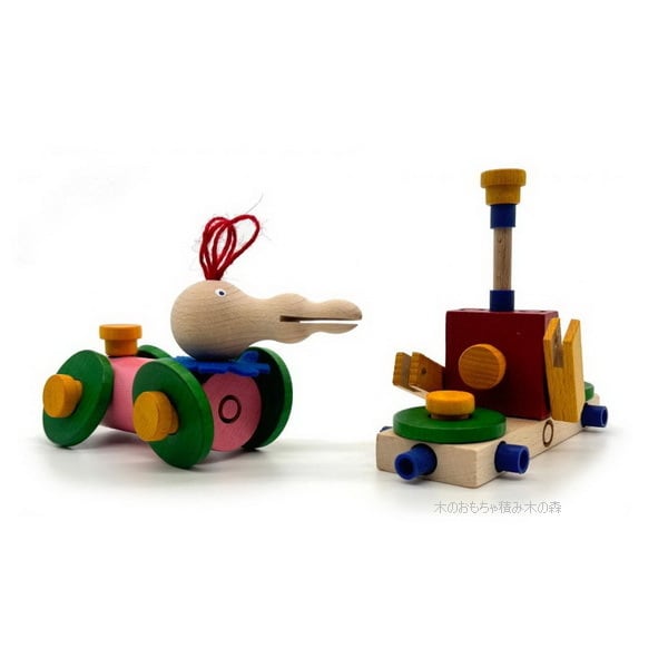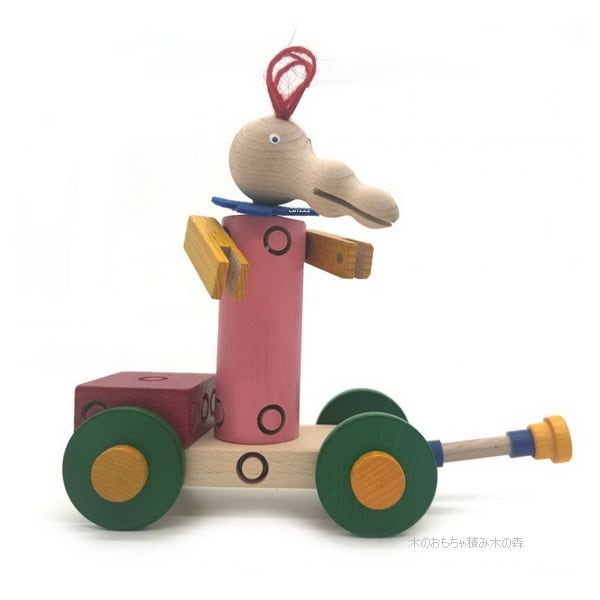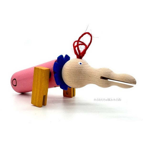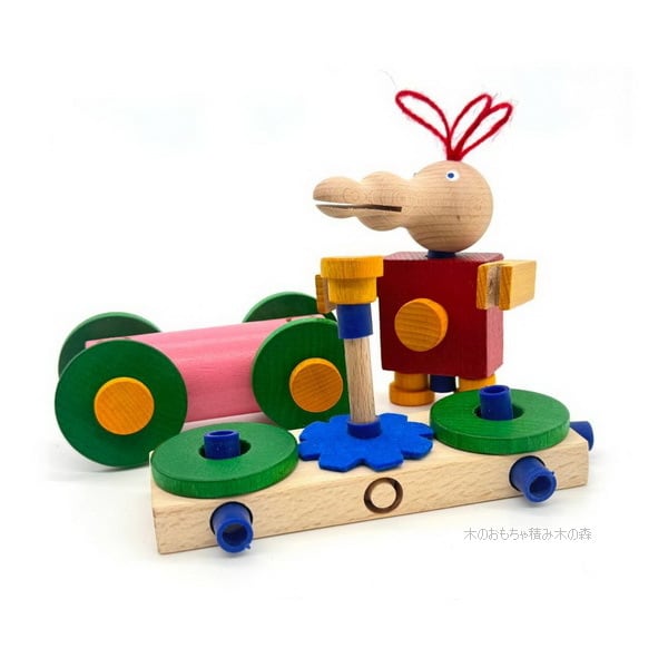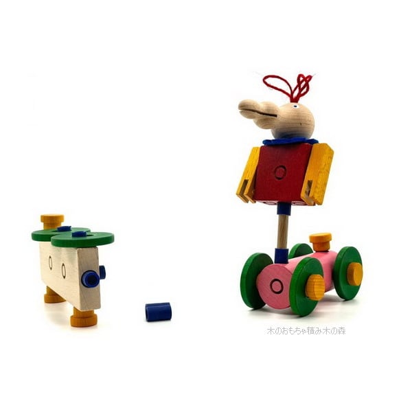 木製パーツをやわらかい筒状のプラスティックのジョイント(青色)でつないで、ユニークな形、人形、動物、乗り物などを作ることができます。