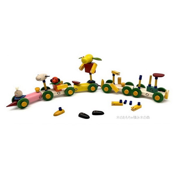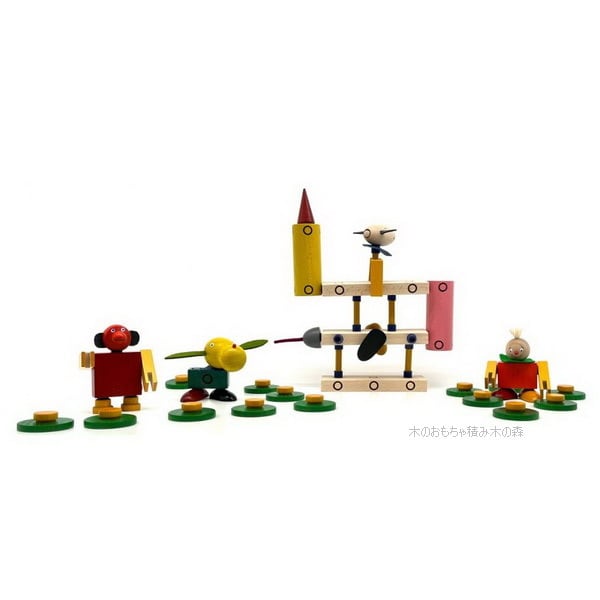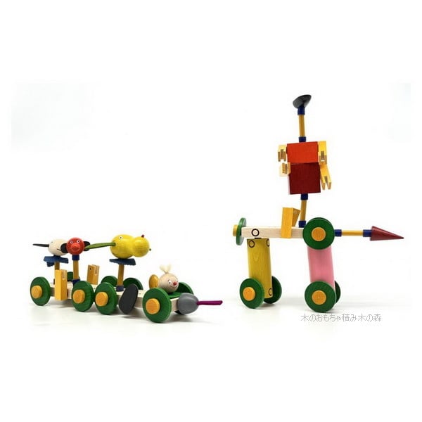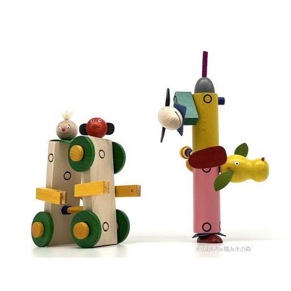 木製パーツをやわらかい筒状のプラスティックのジョイント(青色)でつないで、ユニークな形、人形、動物、乗り物などを作ることができます。