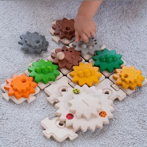 配置するには、パズルピースの真ん中の穴に、好きなギアパズル裏面のねじ部分をはめ込みます。