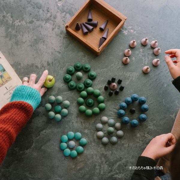 ほかのまんだらシリーズと組み合わせて遊ぶのはもちろんですが、白木の積木とあわせて模様遊びも楽しいです。