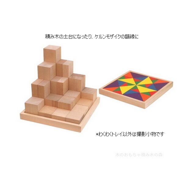 童具館の「わくわくトレイ」は、積み木あそびの土台やモザイク遊びの額縁に使える白木のトレイです。