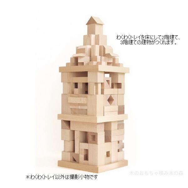 「わくわくトレイ」を積み木の柱に載せて床面にすると、2階・3階以上の建物が簡単に作れます。