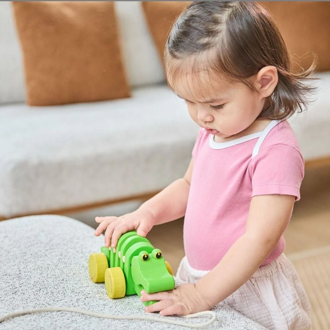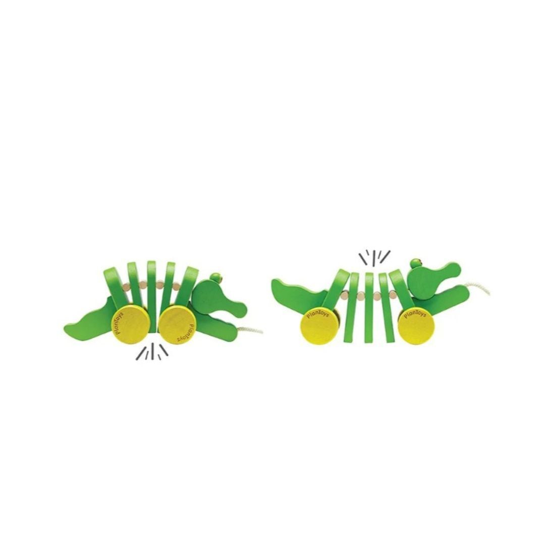 ひもをひっぱると、ワニが体を上下させてカタカタと心地よい音でリズムを刻みながら動きます。