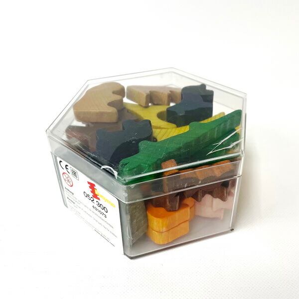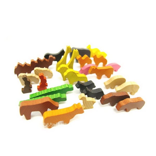 シリーズの中でも人気のセット。きりん、ぞう、くま、ブタなど、こどもたちにもなじみのある動物たちが、30ピースほどが、六角形のプラケースに入っています。単品でも遊べますが、白木の積み木遊びをより楽しくさせる小道具としてもおすすめです。