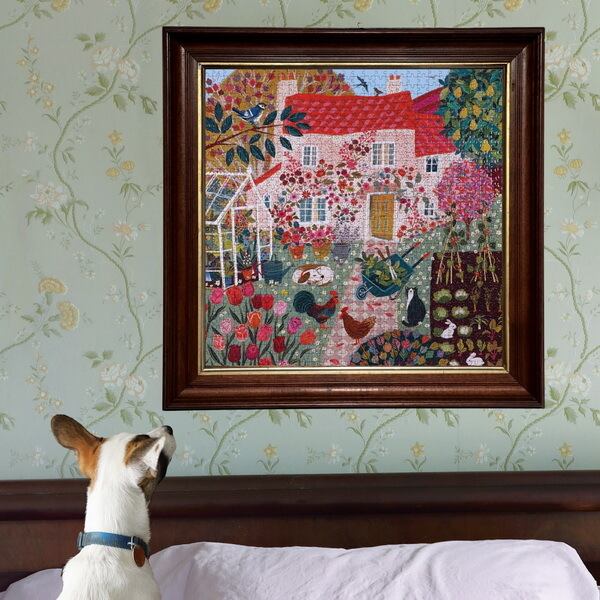 このパズルに描かれているお庭や温室は、1000ピースパズル「ブルーキッチン」の扉の外にも描かれています。お庭で育てた野菜や花がブルーキッチンに飾られているなど、2つの絵柄がリンクしています。完成したパズルの共通点を探したり、部屋の雰囲気に合わせてそれぞれを飾ったり。2つのパズルを揃えて楽しむのもおすすめです。